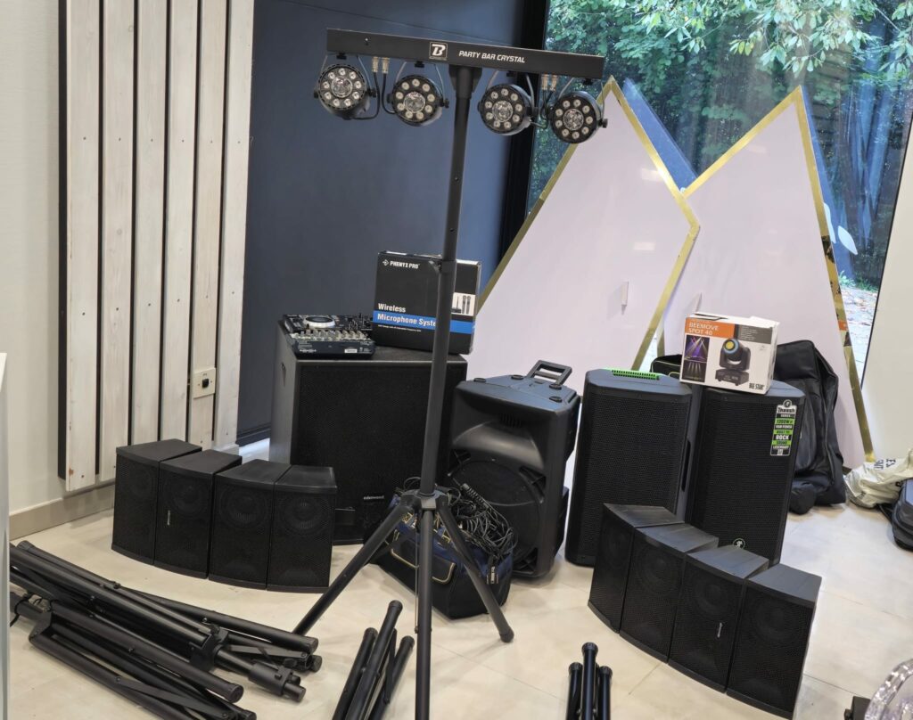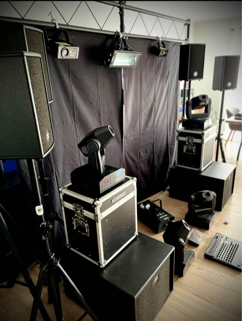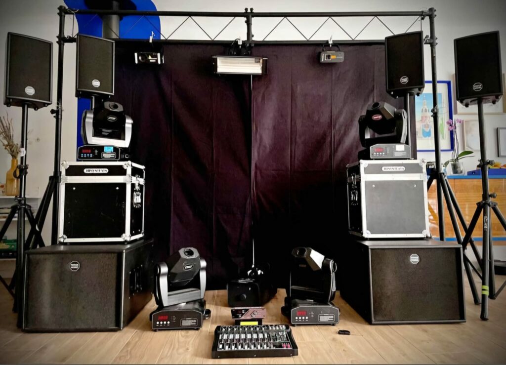 Éclairage et 5 haut-parleurs puissants avec trépieds